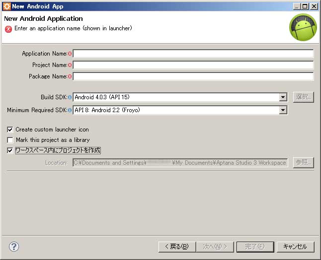 Eclipseで New Android App のウィザードで